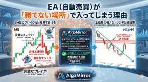 自動売買を使っていると、「5分足で見れば完璧なブレイクなのに、なぜか逆行して負ける」という場面に遭遇します。その原因の多くは、上位足(1時間足や4時間足)の強力なトレンドや抵抗帯、いわゆる「大きな波」を無視していることに […]